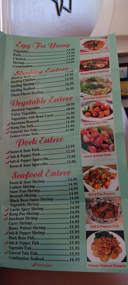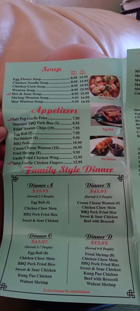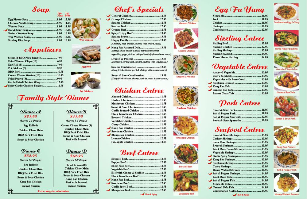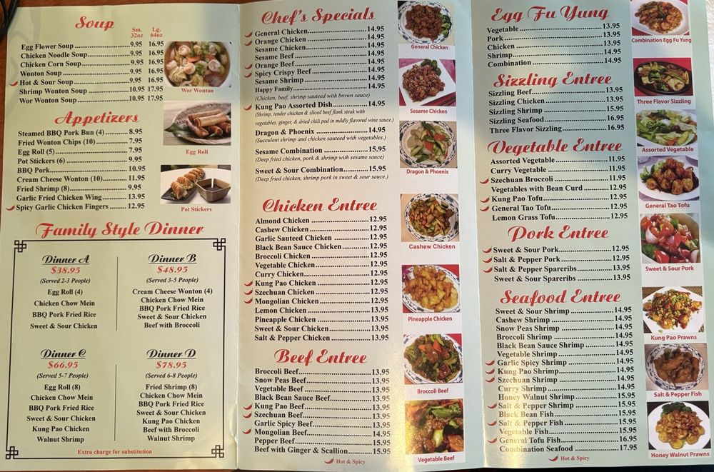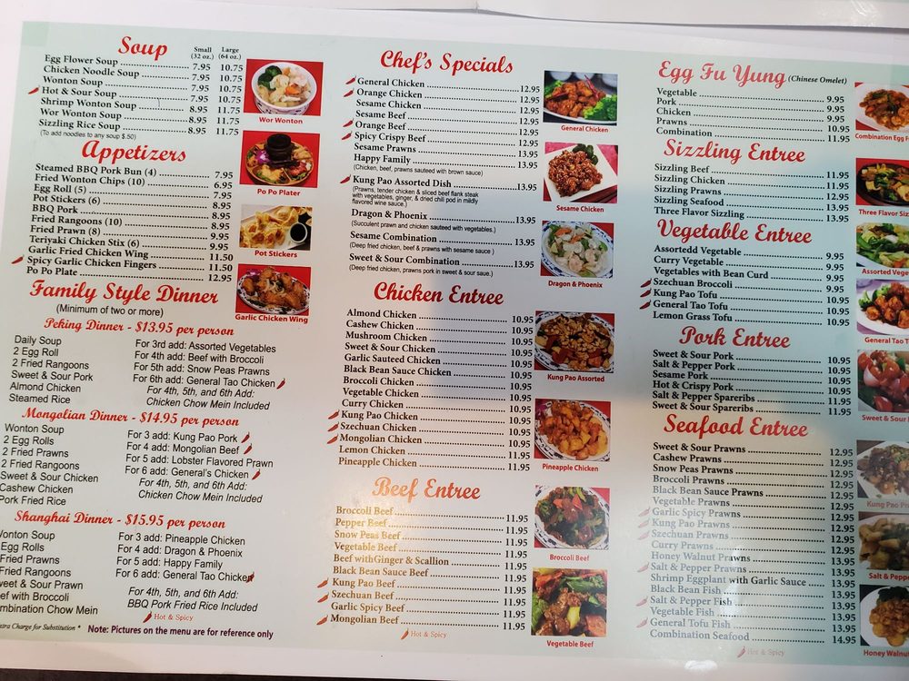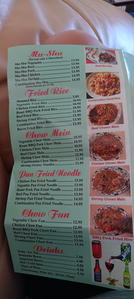 fried shrimp, chicken chow mein, BBQ pork fried rice, sweet and sour chicken, kung pao chicken, broccoli beef, walnut shrimp.